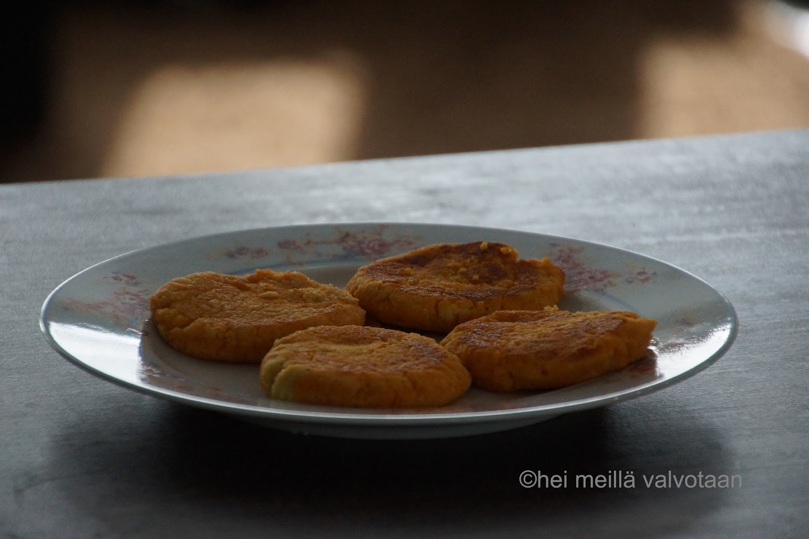 Kypsytä myskikurpitsanpuolikkaita uunissa noin 45 minuuttia (niin kauan, kunnes malto on pehmeää). Kaavi maltoa 5dl kulhoon ja sekoita joukkoon 2 kananmunaa ja 2rkl kookosjauhoa sekä hyppysellinen suolaa. Paista keskilämmöllä pannulla pieniä lettuja voissa, gheessä tai kookosöljyssä.